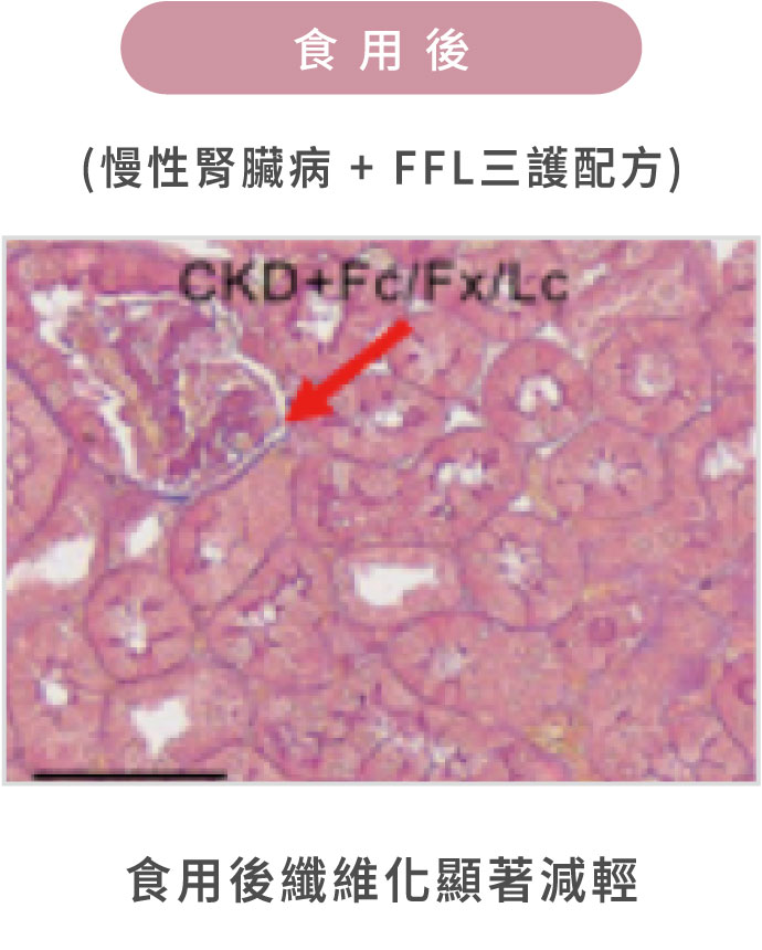 鹼(FFL糖心賢三護配方)可減緩腎臟纖維化、減緩腎小管細胞壞死、改善腎功能與預防腎損傷。